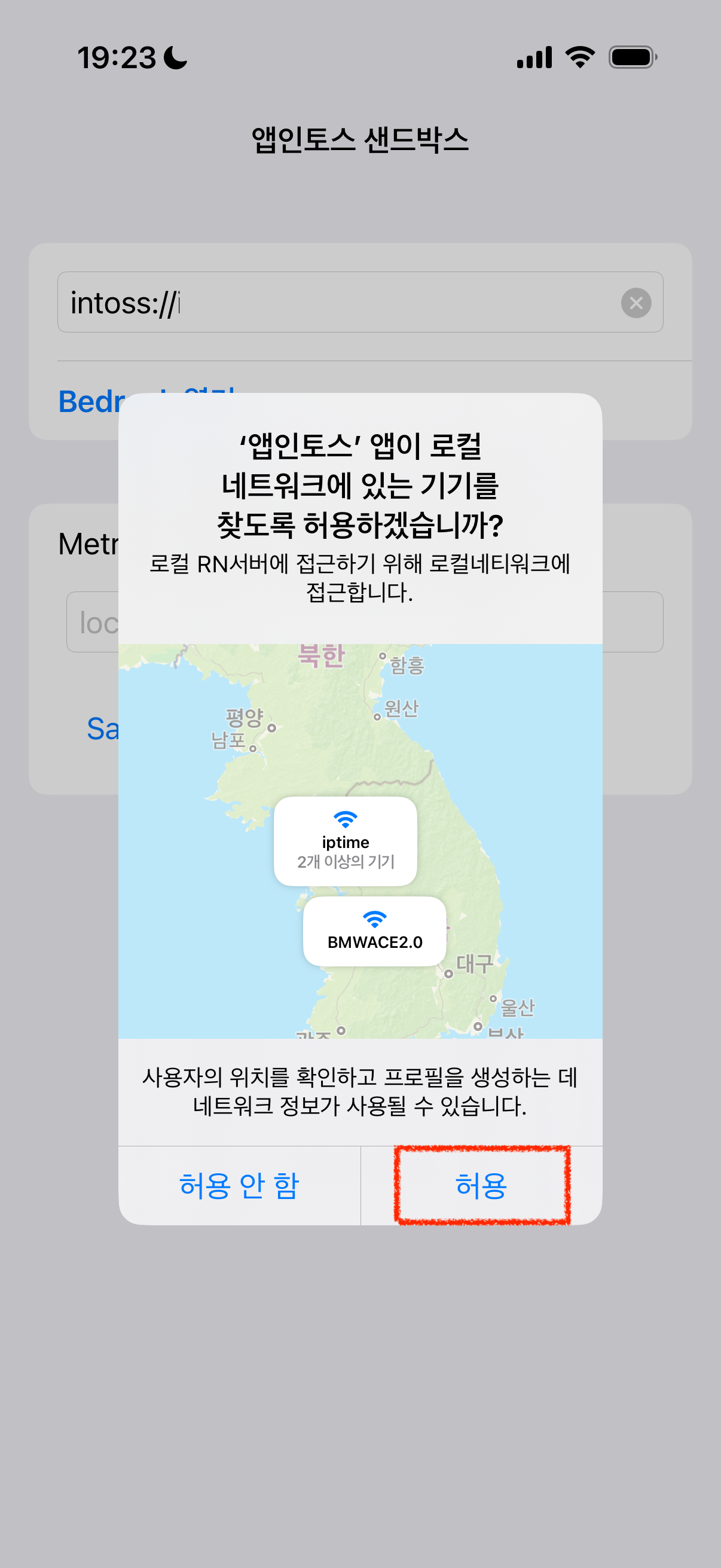 若要在 iPhone 上运行 **App-in-Toss Sandbox App**,iPhone 必须与本地服务器处于同一 Wi-Fi 网络环境。请按照以下步骤进行设置: